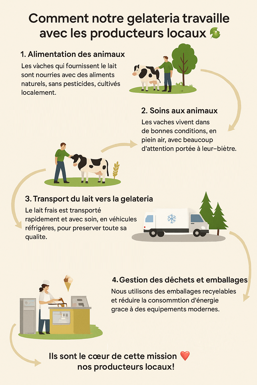La fraise rouge et sucrée vient directement du petit jardin de Madame Dupont 🍓. Le lait frais qu’on utilise est récolté chaque matin à la ferme de Monsieur Martin 🐄, où les vaches vivent en plein air et sont chouchoutées. Grâce à eux, nos glaces ont ce goût unique et naturel que tout le monde adore ! Alors, viens vite goûter une boule de bonheur faite avec amour et respect 🥰.